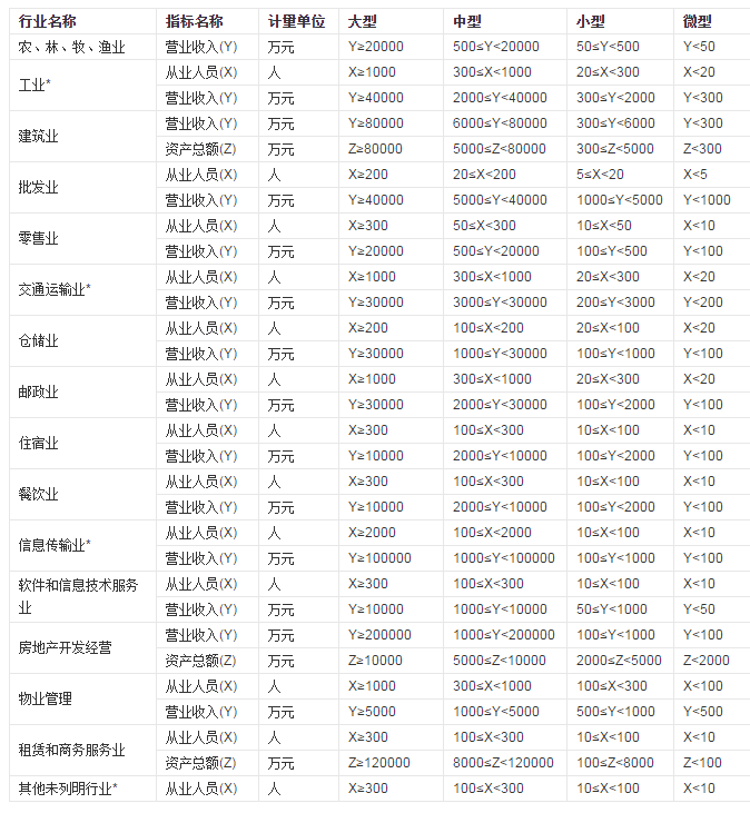 根據工業和信息化部、國家統計局、國家發展改革委、財政部《關于印發中小企業劃型標準規定的通知》,國內的中小微企業按以下標準劃分: