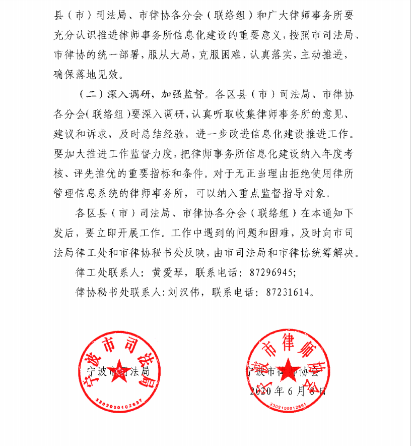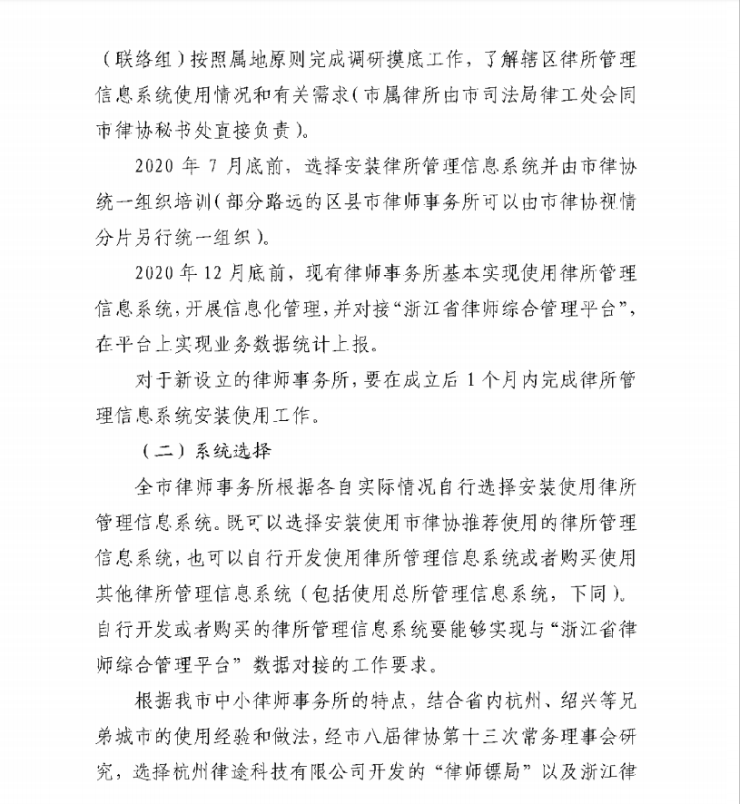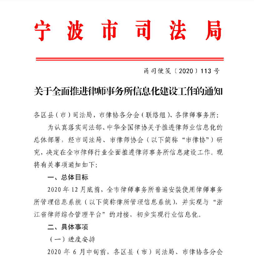 根據(jù)寧波市司法局關(guān)于全面推進(jìn)律師事務(wù)所信息化建設(shè)工作的通知,目標(biāo)將于2020年12月底前,實(shí)現(xiàn)寧波全市律師事務(wù)所普遍安裝并使用律師事務(wù)所管理信息系統(tǒng),并實(shí)現(xiàn)與“浙江省律師綜合管理平臺(tái)”的對(duì)接,初步實(shí)現(xiàn)行業(yè)信息化。