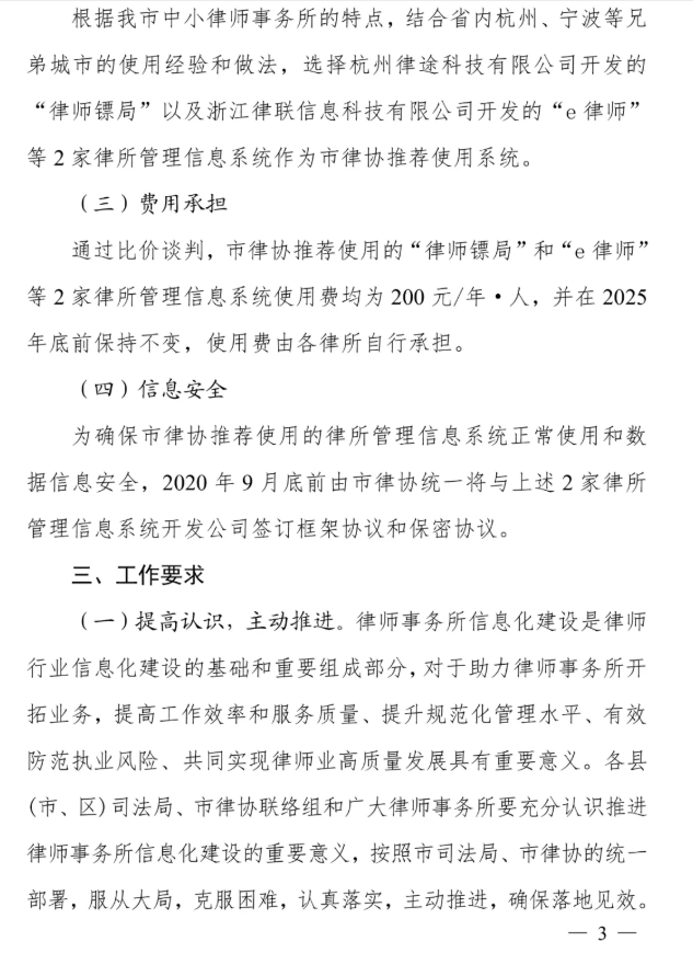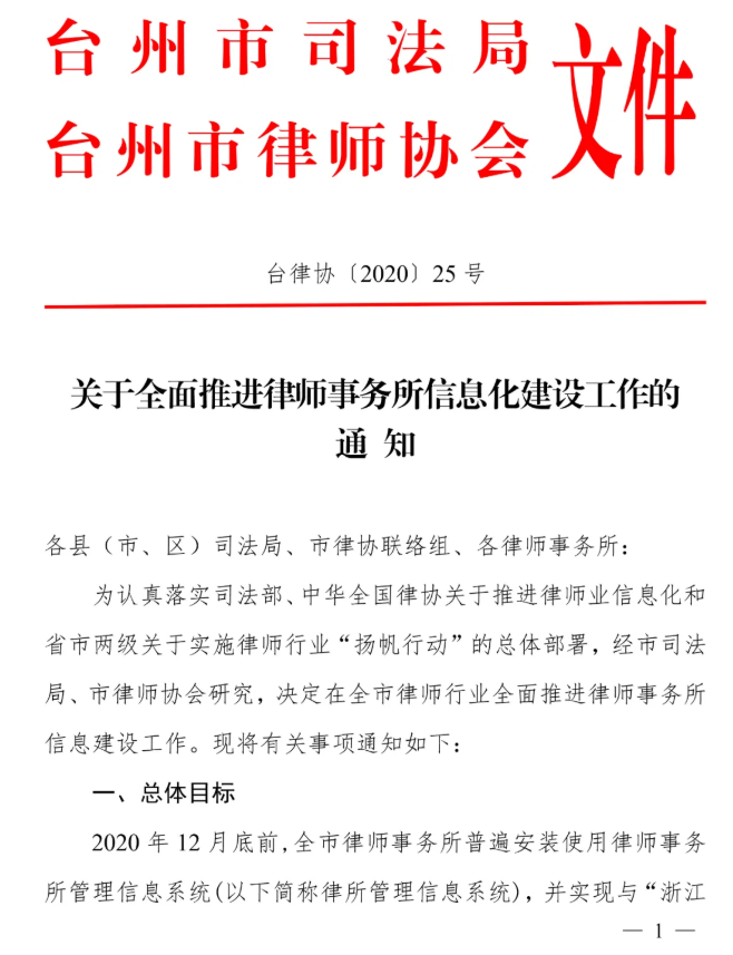 繼杭州、寧波市司法局之后,臺州市司法局、臺州市律協(xié)發(fā)布的臺律協(xié)(2020)05號文件:《關(guān)于全面推進(jìn)律師事務(wù)所信息化建設(shè)工作的通知》,預(yù)計目標(biāo)將于2020年12月底前,推進(jìn)臺州全市律師事務(wù)所信息化建設(shè)工作,并實現(xiàn)與浙江省律師綜合管理平臺完成對接,初步實現(xiàn)律師行業(yè)信息化。