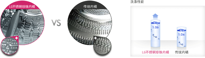 永不生銹(專利)的不銹鋼洗衣滾筒 采用專利的不銹鋼材質的滾筒,能保證衣物不受銹漬污染。傳統的油漆涂層桶長時間使用后漆層容易脫落,與此不同,LG的耐磨不銹鋼內桶非常經久耐用。