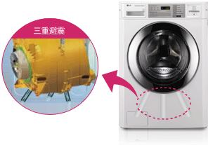 三重減震器 采用三重減震器,用于全方位地吸收和減少震動,從而達到靜音操作。 基于獨立測試,LG滾筒洗衣機和烘干機是同類產品中最靜音的。