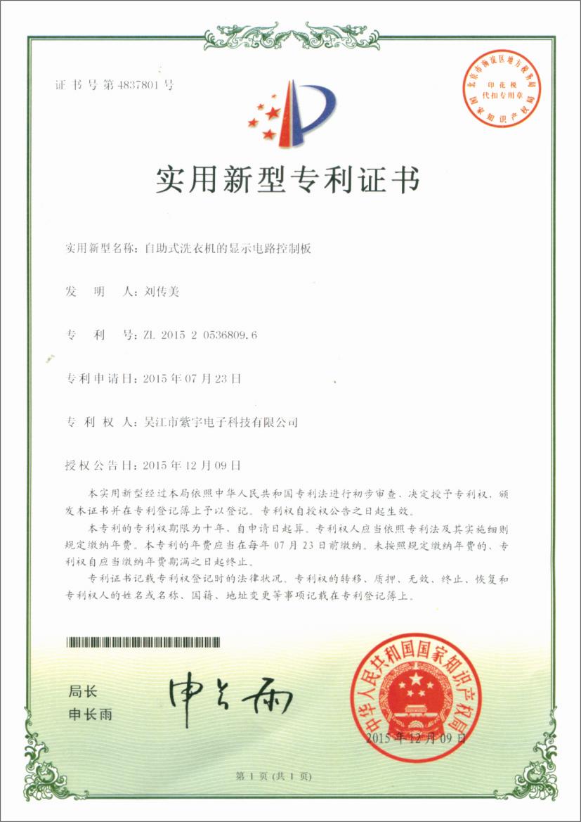自助式洗衣機的顯示電路控制板專利證書